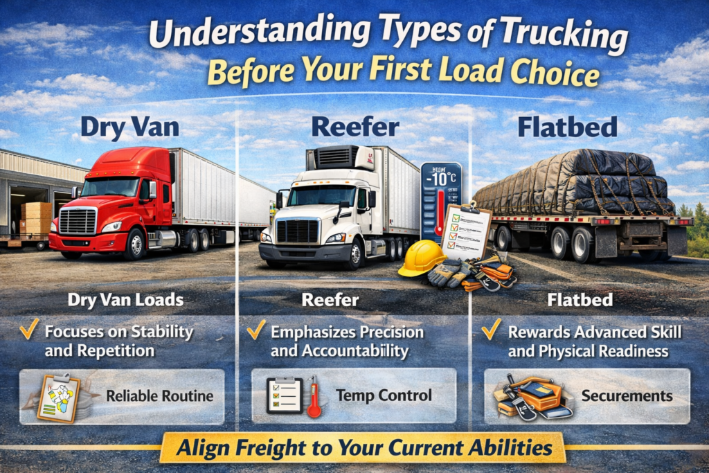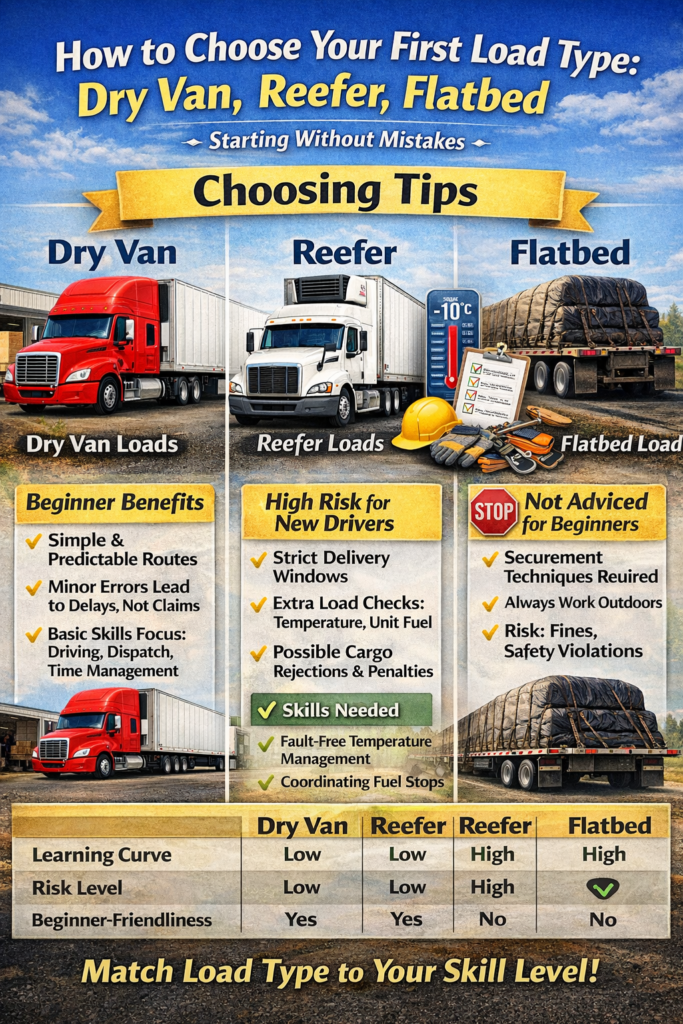 How to Choose Your First Load Type: Dry Van, Reefer, Flatbed — Starting Without Mistakes